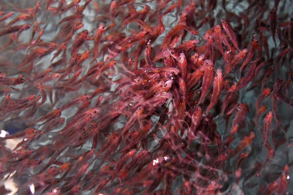 She doesn’t protest, soon gives up her eggs, and I return my charge to her little pool. After adding sperm to the bag and giving the mix a tannic acid wash to prevent clumping and fungus growth, workers take the fertilized eggs to a special isolation room designed to keep out parasites and bacteria and transfer them to special jars for incubation. With luck, nine days later at least 10,000 fry will appear.